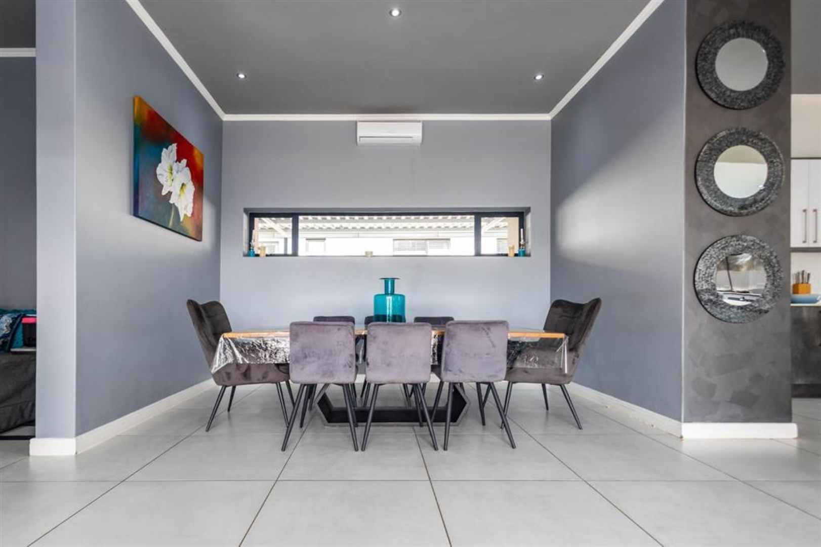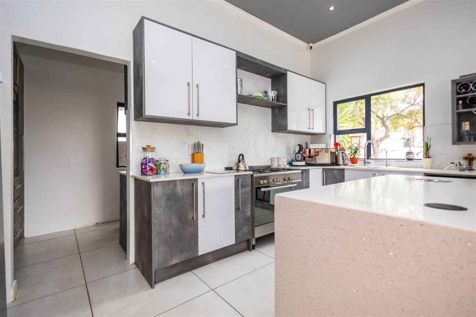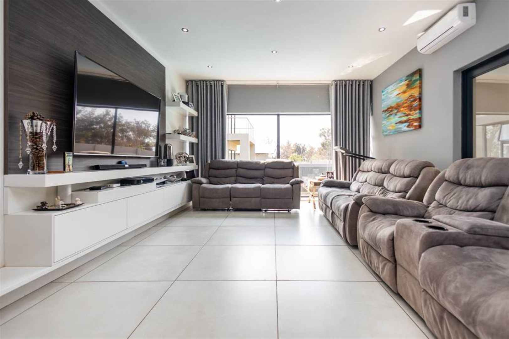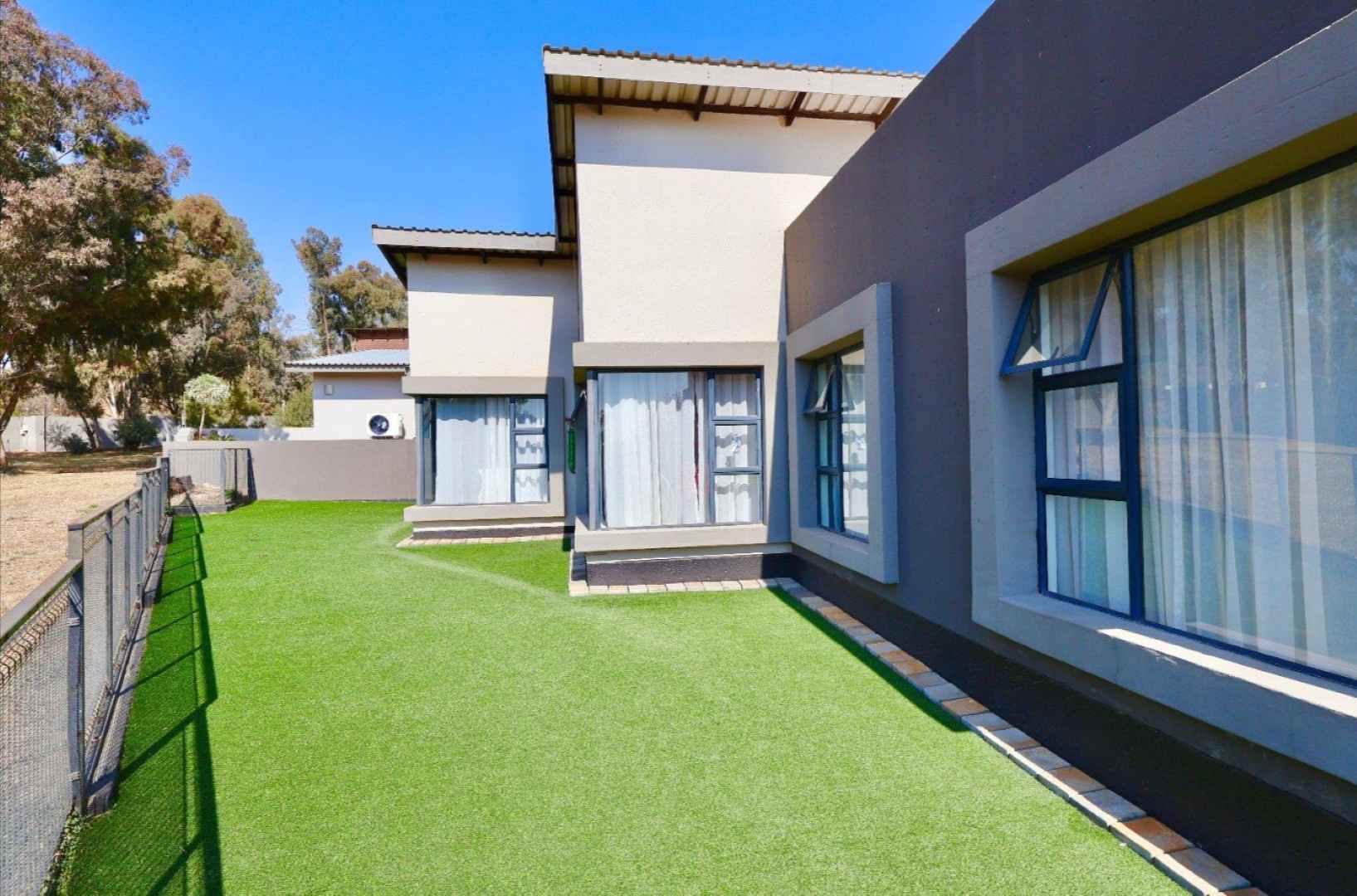 At the heart of the home is a modern, fully equipped kitchen, complete with a separate scullery for added functionality. Built-in cupboards throughout the home provide excellent storage, while tiled floors and an air conditioner add to the overall comfort and convenience.