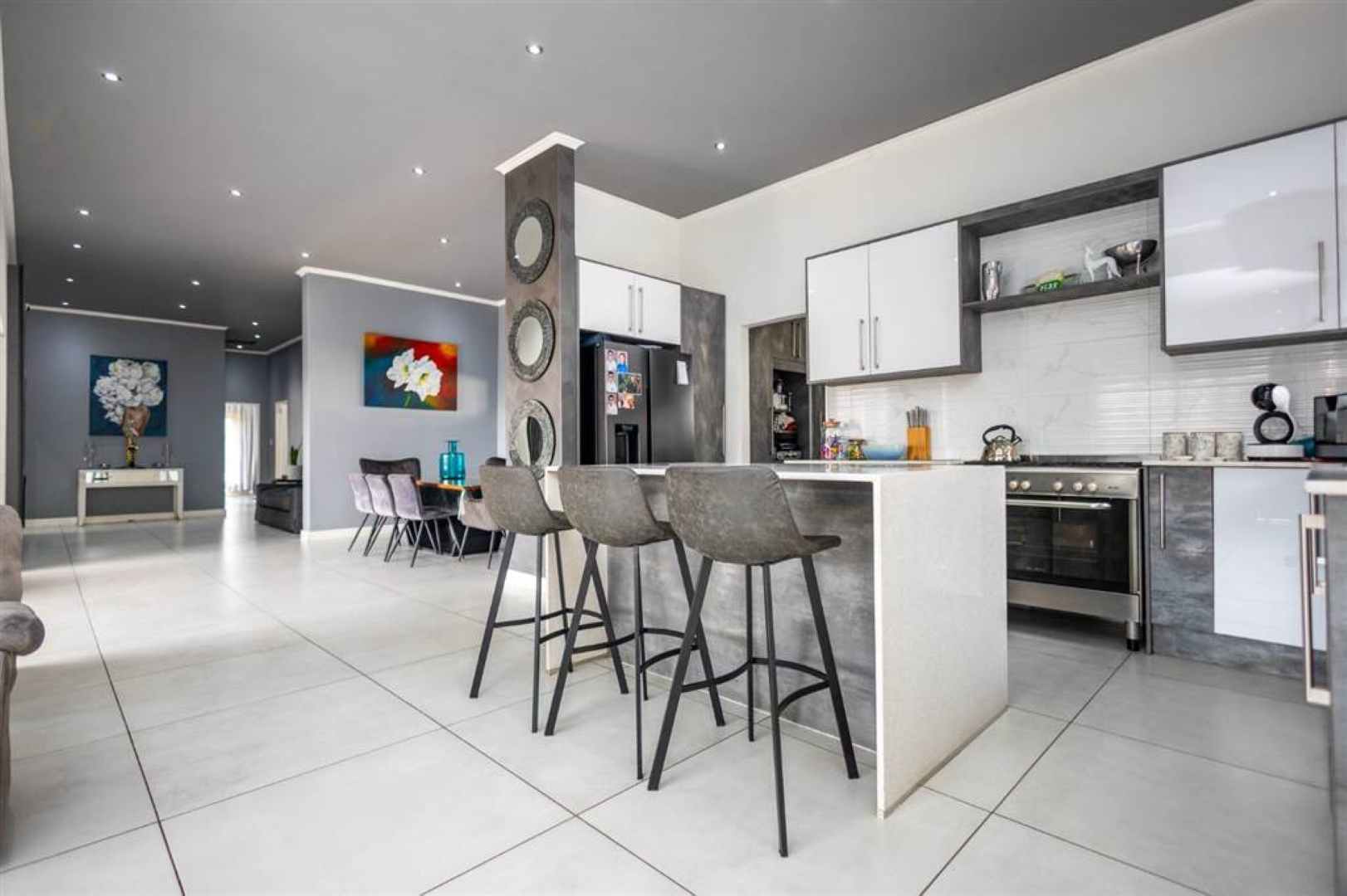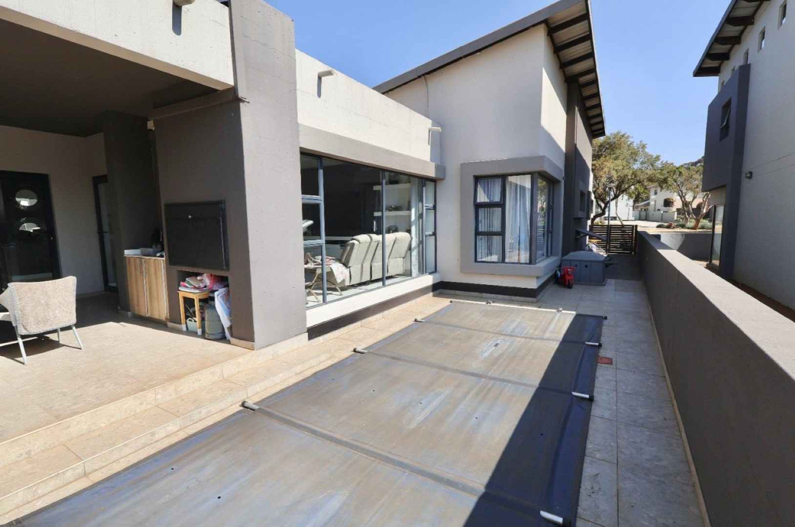 Designed with lifestyle in mind, the property boasts a covered entertainment area with a built-in braai, overlooking a sparkling swimming pool—perfect for hosting or simply enjoying the outdoors. Additional features include staff quarters and a double garage, ensuring practicality meets luxury.